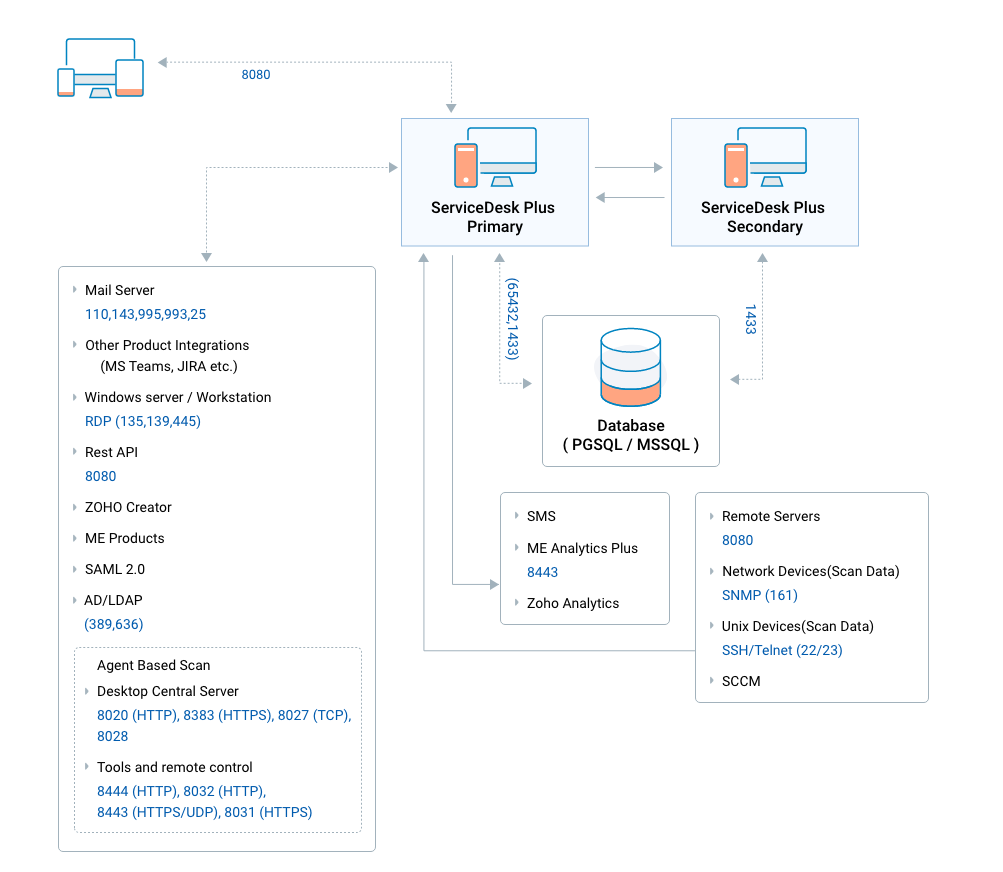 • ServiceDesk Plus به عنوان یک وب‌اپلیکیشن طراحی شده است که شامل سرور وب برای منطق کسب‌وکار و RDBMS برای ذخیره‌سازی داده‌هاست.